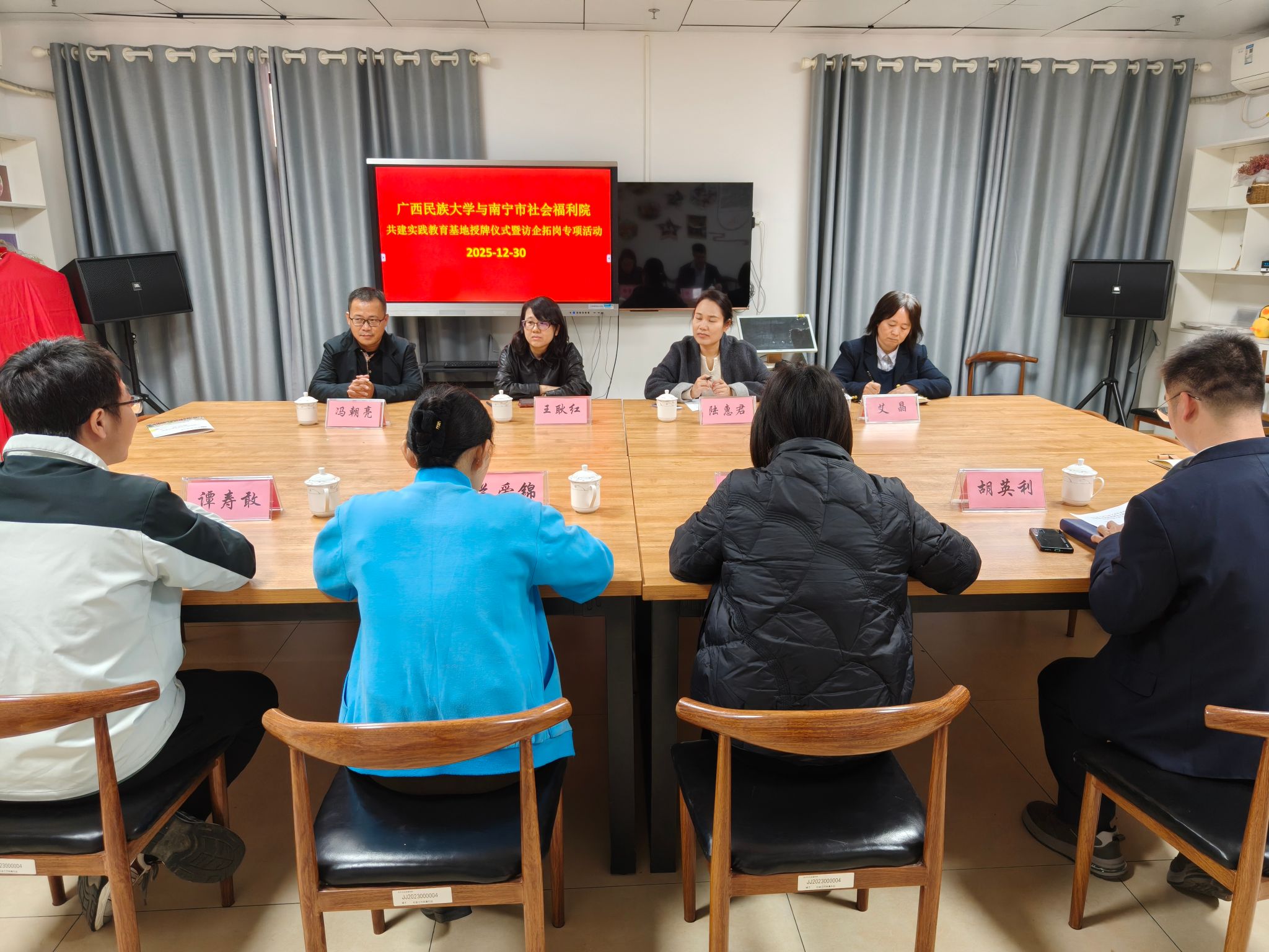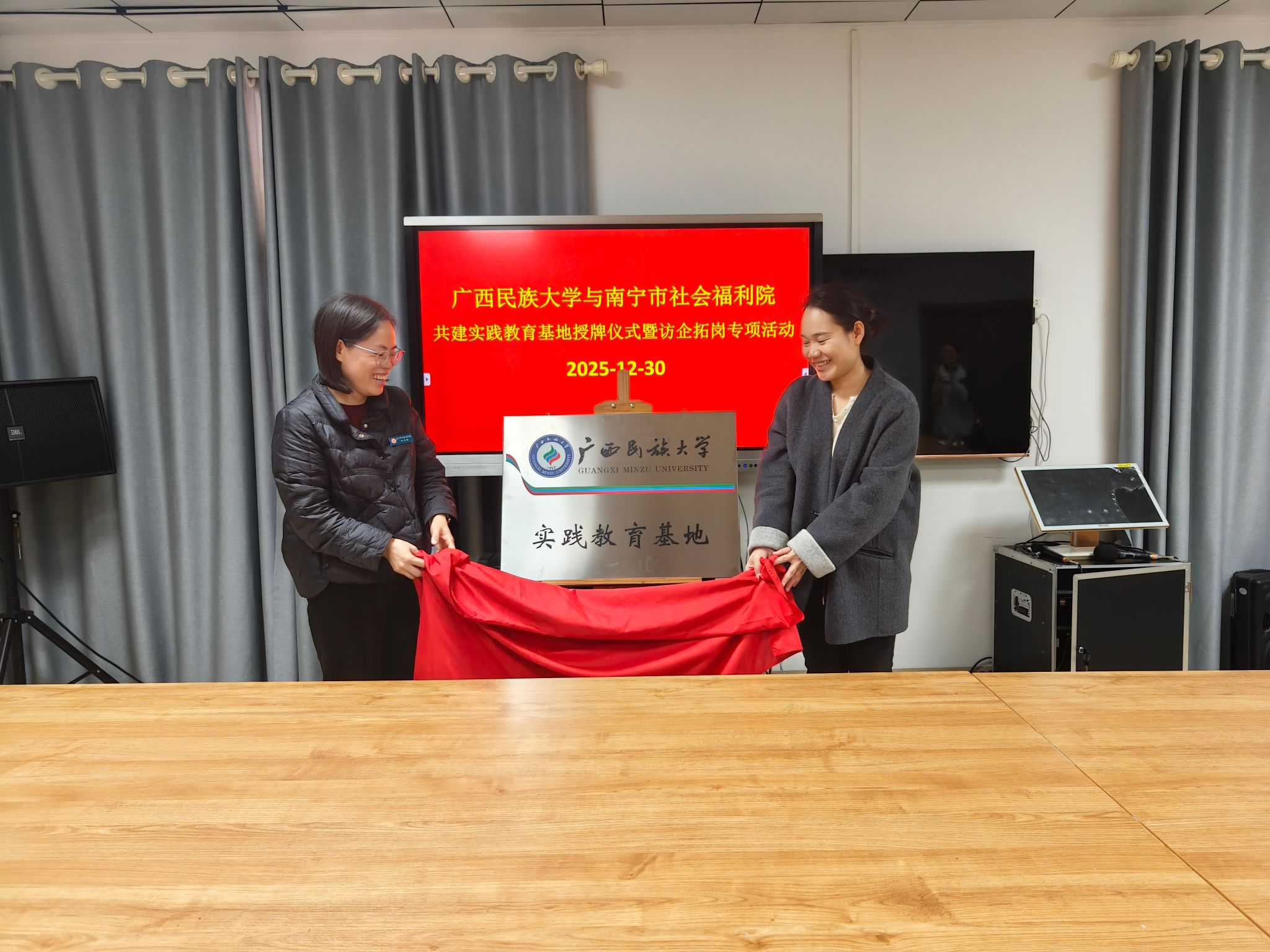2025年12月30日上午,民社学院与南宁市社会福利院共建实践教育基地签约授牌仪式在南宁市社会福利院爱心公寓楼悦逸室顺利举行。此次活动是我校深化“访企拓岗”专项行动、推动社会学及社会工作学科建设与社会服务相结合的重要举措,标志着校地合作在人才培养、实践教学与社会服务融合方面迈入新阶段。