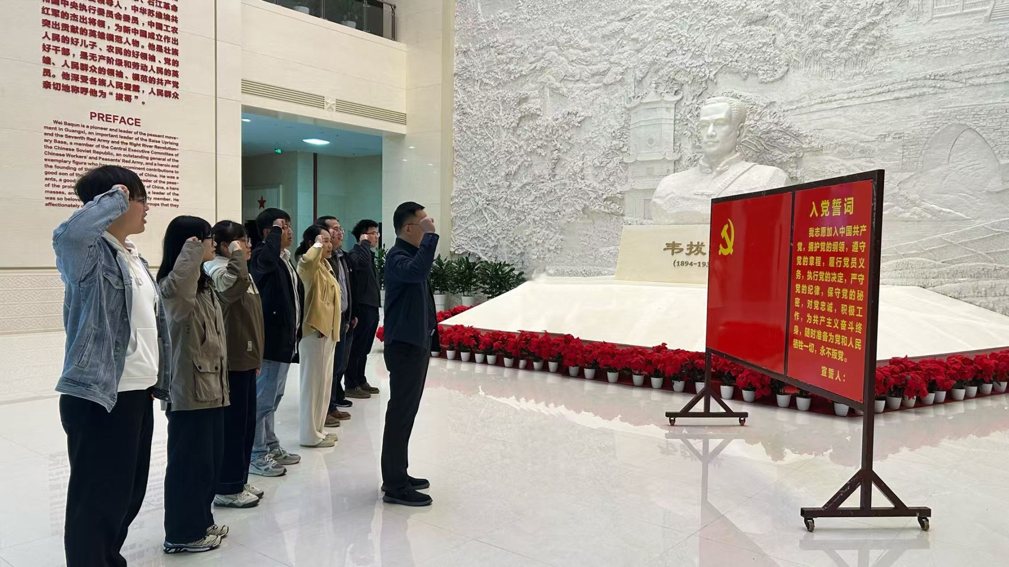 参观结束后,全体成员在纪念馆内庄严肃立,面对鲜红的中国共产党党旗,举行了重温入党誓词仪式。在黄中显书记的领誓下,大家举起右拳,以铿锵有力的声音重温了入党誓词。铮铮誓言表达了师生党员们不忘初心、牢记使命,为党的事业奋斗终身的坚定决心。