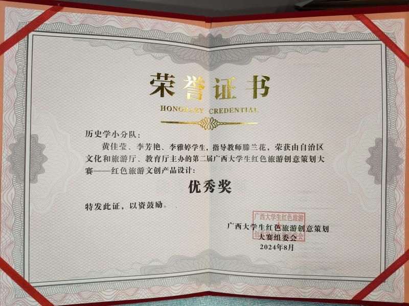 我院2024级中国史硕士研究生黄佳莹和2024级学科教学(历史)硕士研究生李芳艳、李雅婷三人团队,在导师滕兰花教授的悉心指导下,凭借作品《红色桂北图文笔记本》荣获此次赛事的优秀奖。《红色桂北图文笔记本》以广西桂北地区的红色历史为背景,通过图文结合的方式,展现了当地红色旅游的独特魅力。