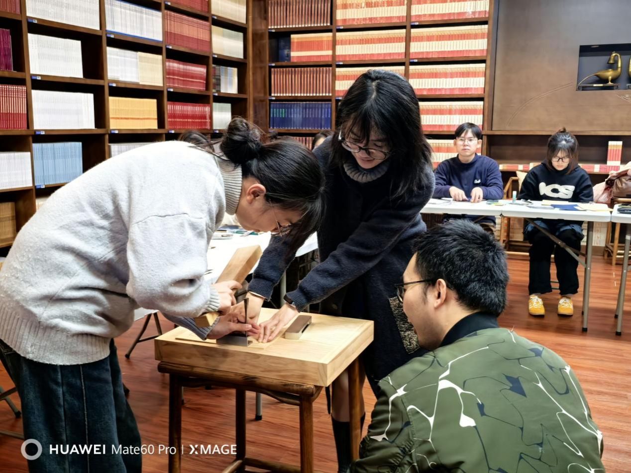 图3:我院学生在古籍修复师杨老师的指导下学习古籍线装打孔