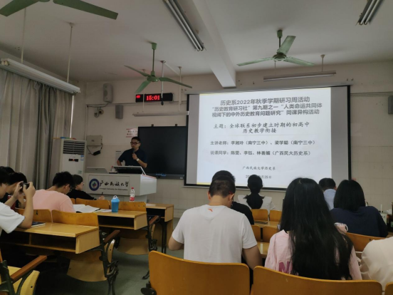 为增强我院历史系本科学生与学科教学(历史)专业研究生对历史教学实践的认识,落实新高考、新课标、新教材理念,提升专业素养,10月25日我院分别邀请南宁三中优秀教师、民大附中优秀教师,共同开展了“人类命运共同体视阈下的中外历史教育问题研究”同课异构活动。