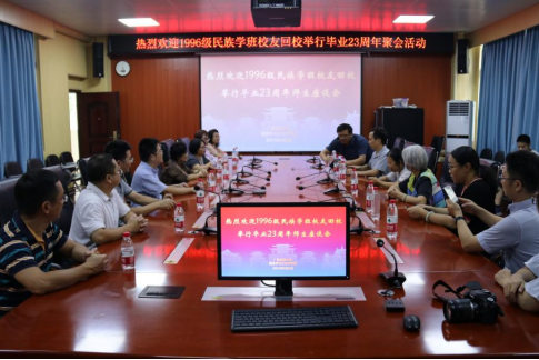 2023年9月2日下午,我院1996级民族学班十余名校友携同家属在基地楼103会议室举行了毕业23周年返校聚会活动。这次活动由李杰校友带头组织,学院院长郝国强、副院长黄兰红,民族学系教师吴国富、黎永励,原民族研究所副所长韦玲以及退休老教授李土玉等参加座谈会。会议由吴国富老师主持。