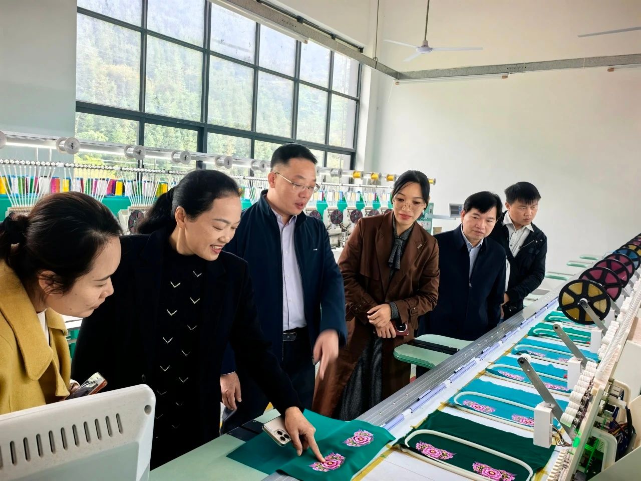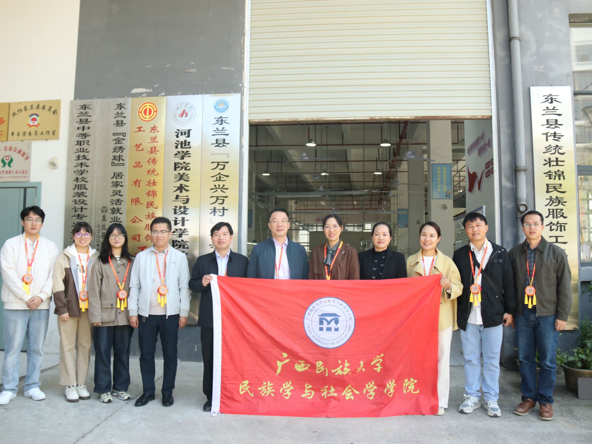 2025年11月14日,betway必威西汉姆联官网民族学与社会学学院党委书记黄中显、党委副书记陆惠君、副院长陈锦均一行赴东兰县传统壮锦民族服饰工艺品有限公司开展实地调研。东兰县委常委、统战部部长韦彩秀,县工商联主席韦遥陪同调研。