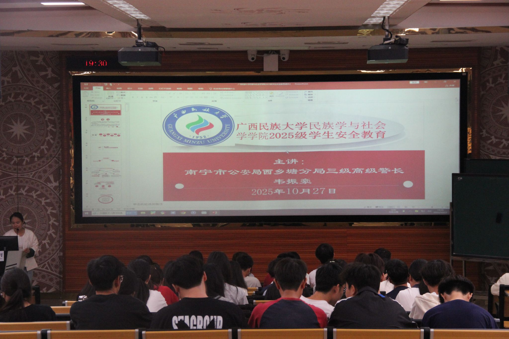 为切实增强学生安全意识,提高自我保护能力,10月27日晚,民族学与社会学学院在学友楼105室组织开展2025级学生安全教育活动。本次安全教育由学院党委副书记陆惠君主持,特邀韦振豪警官担任主讲。