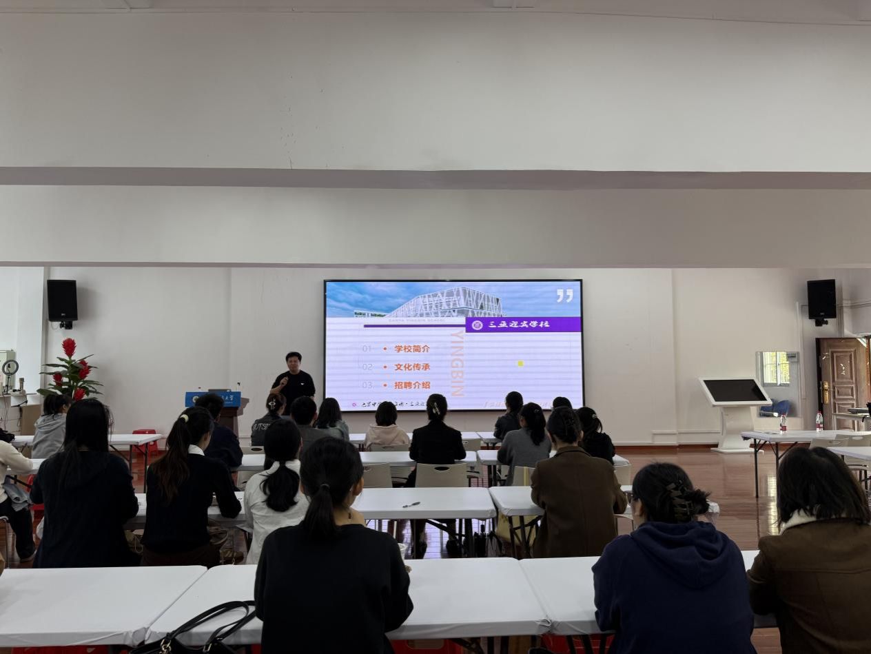 龙海波梁耀宗分别详细介绍了三亚市迎宾学校的办学特色、师资队伍建设情况及近年来的育人成果,并重点解读了学校教师招聘政策、岗位需求及职业发展路径。现场氛围活跃,在场学生分享了在求职中遇到的挑战并参加现场面试招聘。