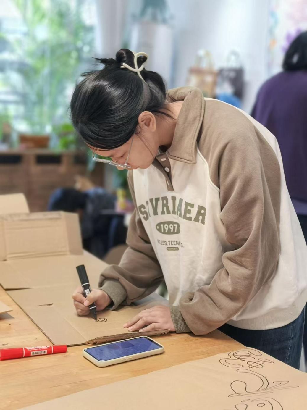 此外,5名同学加入农墟文创小组,以广西左江花山岩画文化景观为灵感,利用回收硬纸箱创作出一组富有民族特色的立体人物剪影。他们细致揣摩岩画中的人物形态与舞蹈动作,将古朴线条与现代设计相融合,剪裁并拼贴出一系列生动夸张的“岩画小人”,最终组装成可供互动拍照的“花山岩画打卡点”,成为市集中一道融汇古今的文化风景。此外,3名擅长手工艺的同学则以钩织技艺制作系列装饰小品,为现场增添了一份手作的温度。
