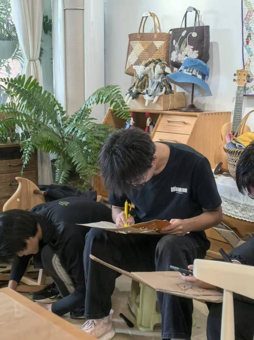 在充分了解农墟文化背景后,同学们分组投入到物料筹备工作中。一组同学手绘“丰年庆”主题宣传标语,用丙烯马克笔在牛皮纸上绘出丰收祝愿;另一组同学则利用纸皮、废旧布料等环保材料进行裁剪与装饰物料。同学们还两人一组,依据农墟提供的16位摊主资料,为每位摊主量身绘制创意海报,生动呈现各农场的生态理念、产品特色与人文故事。