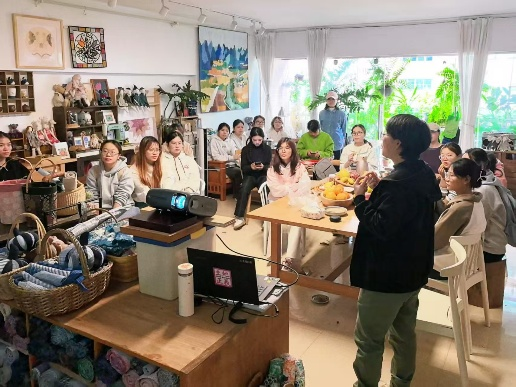 活动伊始,都市农墟志愿者孟芳为同学们生动介绍了南宁都市农墟的发展历程与核心理念,并详细讲解了农墟在生态农业推广、手工艺创作、社区共建等多个板块的工作内容。随后,各板块志愿者依次分享了他们在产品协作、活动策划、文化传播等方面的具体实践,让同学们对农墟的运作模式与社会意义有了更深地理解。在轻松愉快的交流环节,学生志愿者积极提问,农墟伙伴真诚回应,双方在对话中建立起温暖的协作纽带,也为接下来的物料共创注入了更多灵感与共识。