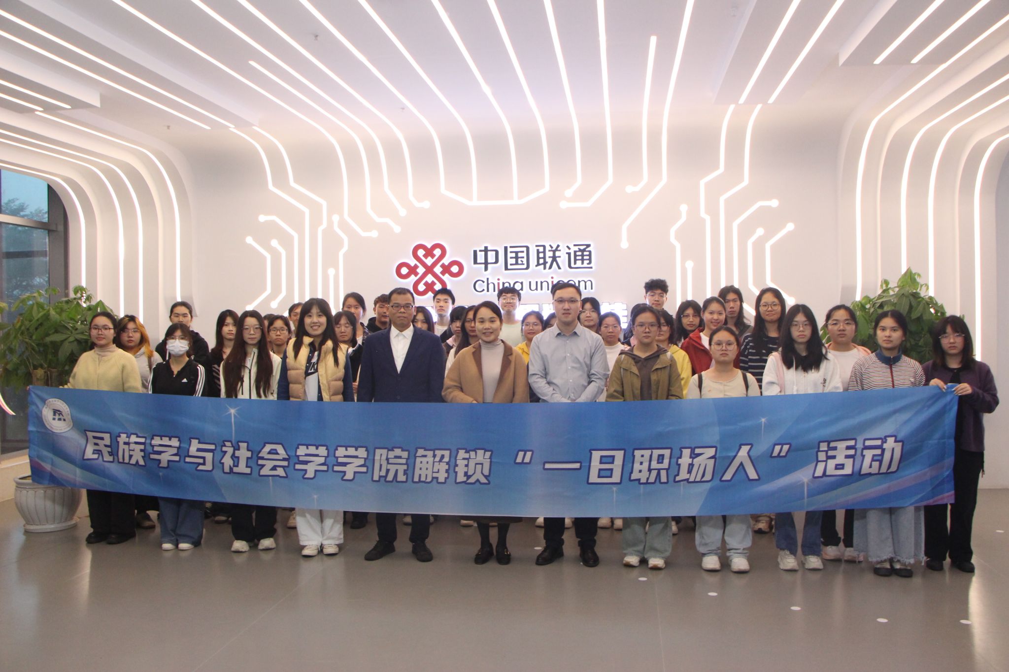 拓宽学生就业视野、深化校企合作,12月12日下午,民族学与社会学学院组织2023级学生前往中国联通南宁市分公司,开展“一日职场人”参观体验活动。学院党委副书记陆惠君、辅导员王颖超带队参加,中国联通副总经理梁航、校园经理黄胜立共同接待。
