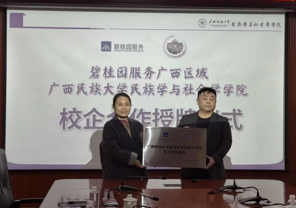 12月30日下午,我院与碧桂园服务广西区域校企合作签约仪式在学院顺利举行。碧桂园服务广西区域南宁公司总经理李富泰、人力资源总经理孟颖、高级经理宁庆玲一行到访交流。我院党委副书记陆惠君、社会学系教师代表黄雁玲、曹晗、陈彪及就业辅导员王颖超共同参会。