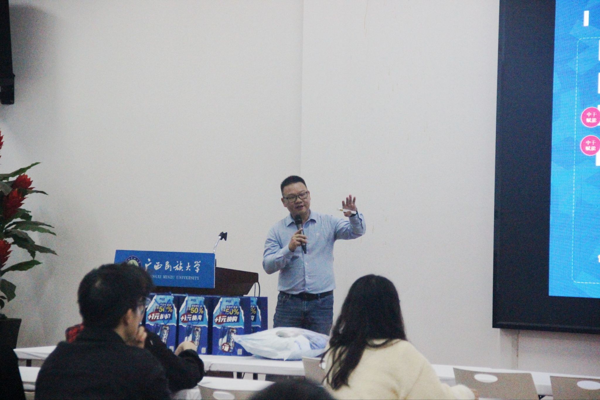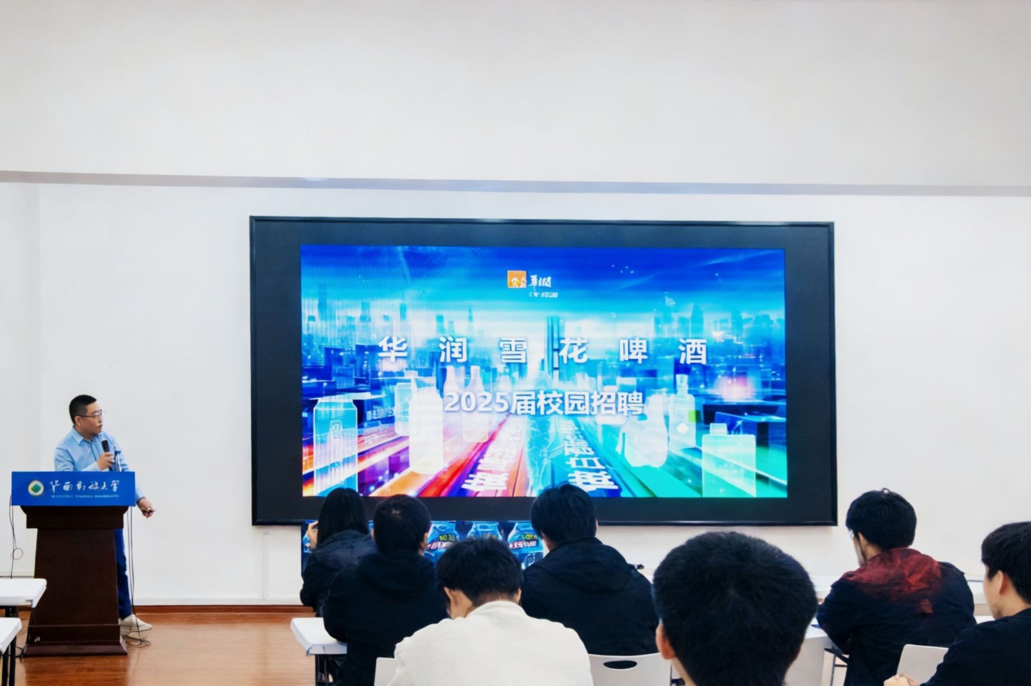 宣讲会上,方仁建详细介绍了华润雪花啤酒的发展历程、企业规模、产业布局、社会责任与企业文化,并通过宣传片生动展示了公司的发展脉络与品牌形象。在互动交流环节,企业代表向同学们展示了多款雪花啤酒产品,以轻松活泼的形式与在场学生交流互动,现场气氛热烈。